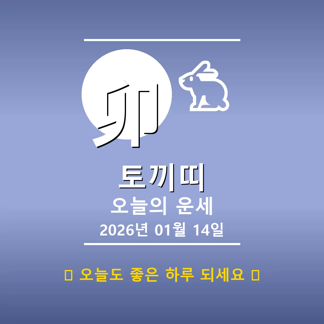안녕하세요, 토끼띠 여러분! 2026년 1월 14일, 오늘은 여러분의 숨겨진 잠재력이 깨어나는 날이 될 수 있습니다. 사주를 살펴보니, 여러분의 일주가 丙寅(병인)으로, 따뜻한 햇살을 머금은 호랑이의 기운을 가지고 있네요. 오늘은 이 긍정적인 에너지를 맘껏 활용하여 하루를 활기차게 시작해보세요!