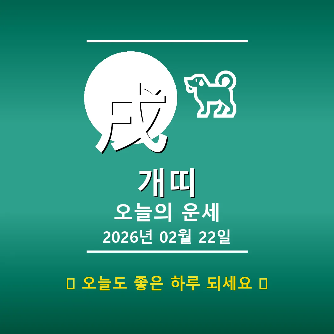 🐕 개띠 해당 연생 : 1910년, 1922년, 1934년, 1946년, 1958년, 1970년, 1982년, 1994년, 2006년, 2018년생 안녕하세요, 개띠 여러분! 2026년 2월 22일, 오늘은 丙午(병오)년, 庚寅(경인)월, 壬午(임오)일의 기운이 함께하는 날입니다. 사주를 살펴보니, 불(火)의 기운이 강하게 느껴지네요. 하지만 걱정 마세요! 균형을 맞출 수 있도록 제가 꼼꼼하게 운세를 풀어드릴게요. 오늘 하루, 긍정적인 마음으로 시작해볼까요? 📊 오늘의 개띠 운세 요약 … Read more