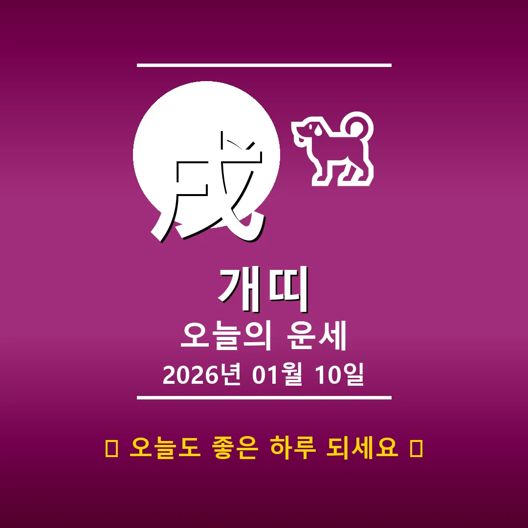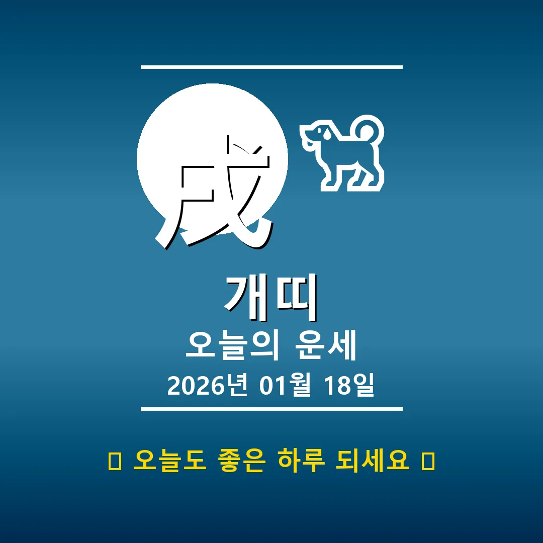 🐕 개띠 해당 연생 : 1910년, 1922년, 1934년, 1946년, 1958년, 1970년, 1982년, 1994년, 2006년, 2018년생 안녕하세요, 개띠 여러분! 2026년 1월 19일, 오늘은 戊申(무신)일로, 여러분의 하루는 묵직한 土(토)의 기운과 함께 시작됩니다. 안정과 끈기가 돋보이는 하루가 예상되지만, 한편으로는 고집스러워질 수도 있으니 융통성을 발휘하는 것이 중요합니다. 특히 사주에 土(토)가 4개나 되니 더욱 그렇겠죠? 자, 그럼 오늘 하루, 행운을 … Read more