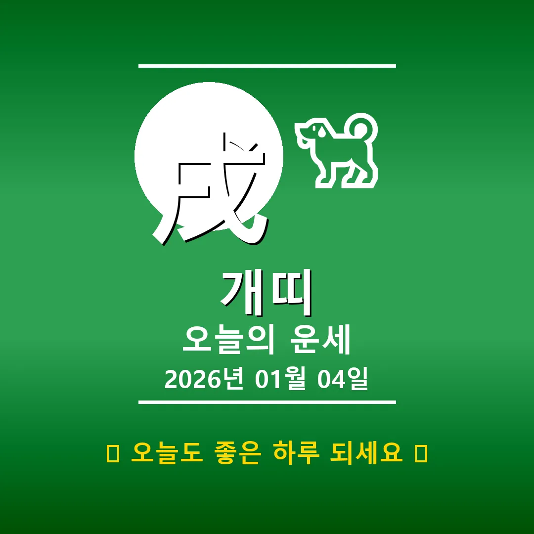 🐕 개띠 해당 연생 : 1910년, 1922년, 1934년, 1946년, 1958년, 1970년, 1982년, 1994년, 2006년, 2018년생 안녕하세요, 개띠 여러분! 2026년 1월 4일, 활기찬 하루가 시작되었나요? 오늘은 여러분의 사주를 바탕으로 운세를 풀이해 드릴게요. 乙酉(을유)년, 戊子(무자)월에 태어난 개띠 여러분, 오늘의 일주인 癸巳(계사)가 여러분에게 어떤 영향을 줄지 함께 알아볼까요? 오늘은 꼼꼼한 계획과 실행력이 중요한 날이 될 거예요! 📊 오늘의 … Read more