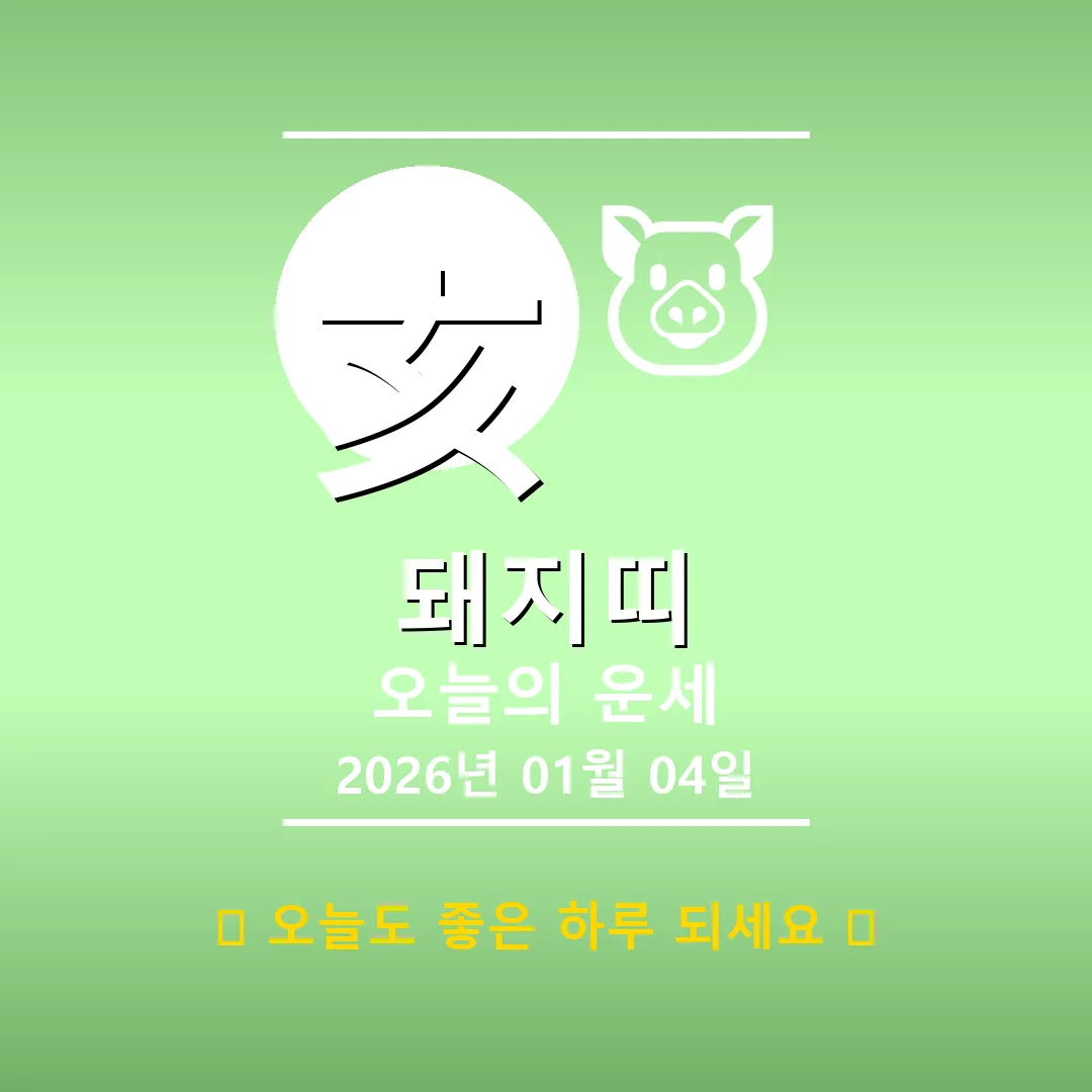 🐷 돼지띠 해당 연생 : 1911년, 1923년, 1935년, 1947년, 1959년, 1971년, 1983년, 1995년, 2007년, 2019년생 오늘 돼지띠 여러분, 2026년 1월 4일의 기운을 받아 힘차게 시작해볼까요? 오늘은 사주 4주를 살펴보니 연주에 丙戌(병술), 월주에 庚子(경자), 일주에 戊戌(무술), 시주에 戊午(무오)가 자리 잡고 있네요. 土(토) 기운이 강하고, 火(화) 기운이 함께하는 날이니, 안정감 속에서 열정적인 에너지를 발휘할 수 있을 거예요! … Read more