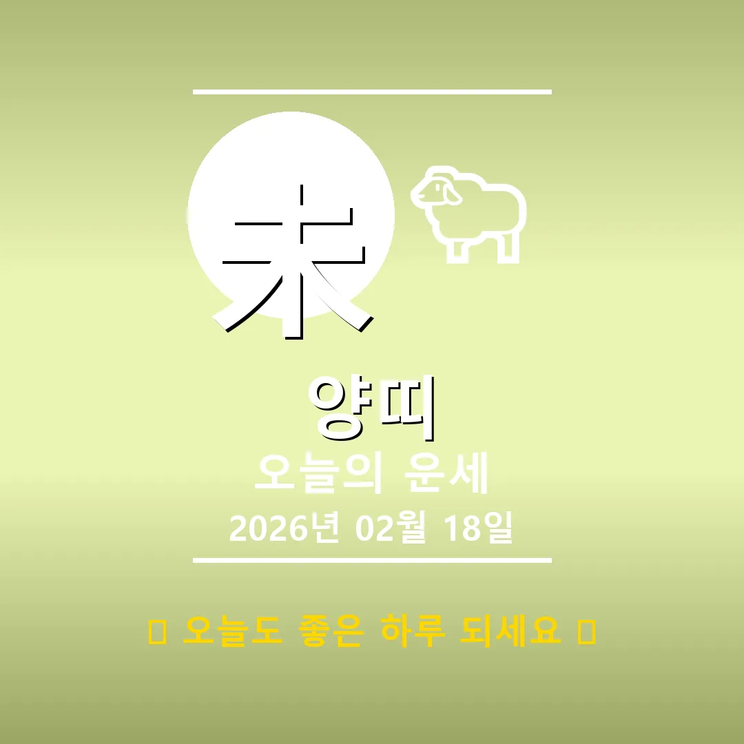 🐑 양띠 해당 연생 : 1907년, 1919년, 1931년, 1943년, 1955년, 1967년, 1979년, 1991년, 2003년, 2015년생 2026년 2월 15일, 양띠 여러분! 오늘은 기미일주(己未日柱)의 날로, 흙(土)의 기운이 강하게 느껴지는 하루입니다. 여러분의 타고난 온화함과 끈기에 긍정적인 에너지를 더해줄 거예요. 다만, 사주에 木(목) 기운이 다소 부족하니, 주변 사람들과의 소통에 조금 더 신경 쓰는 것이 좋겠습니다. 📊 오늘의 양띠 운세 … Read more