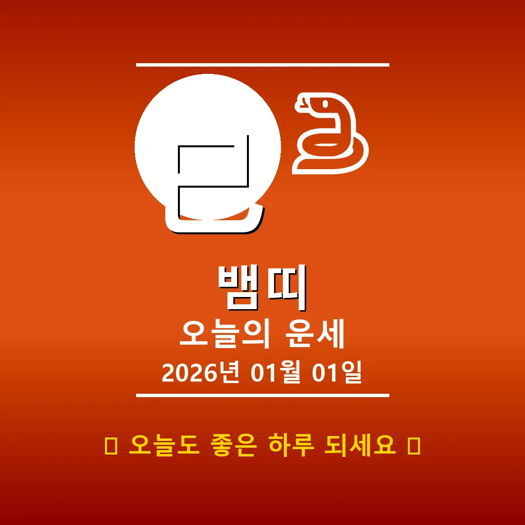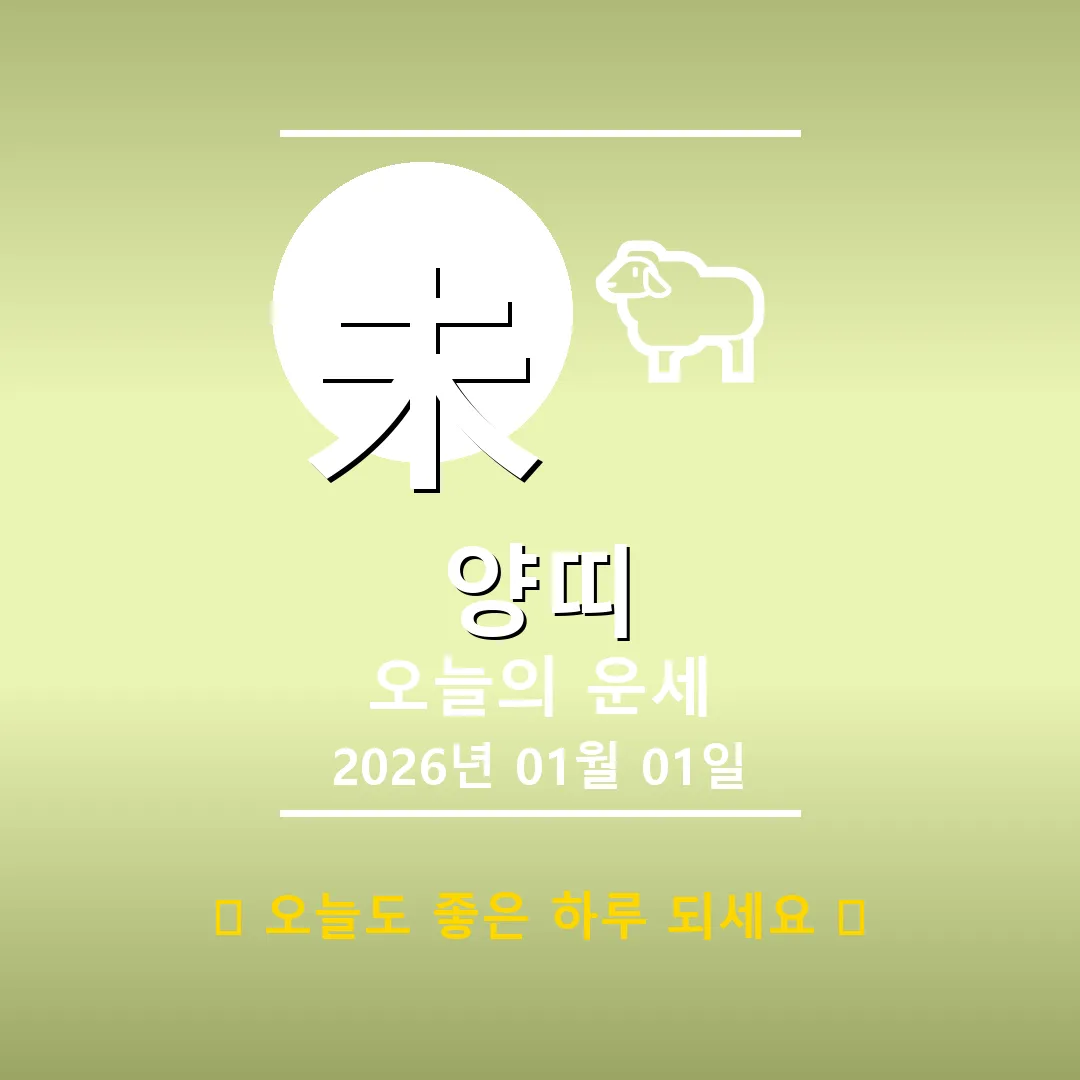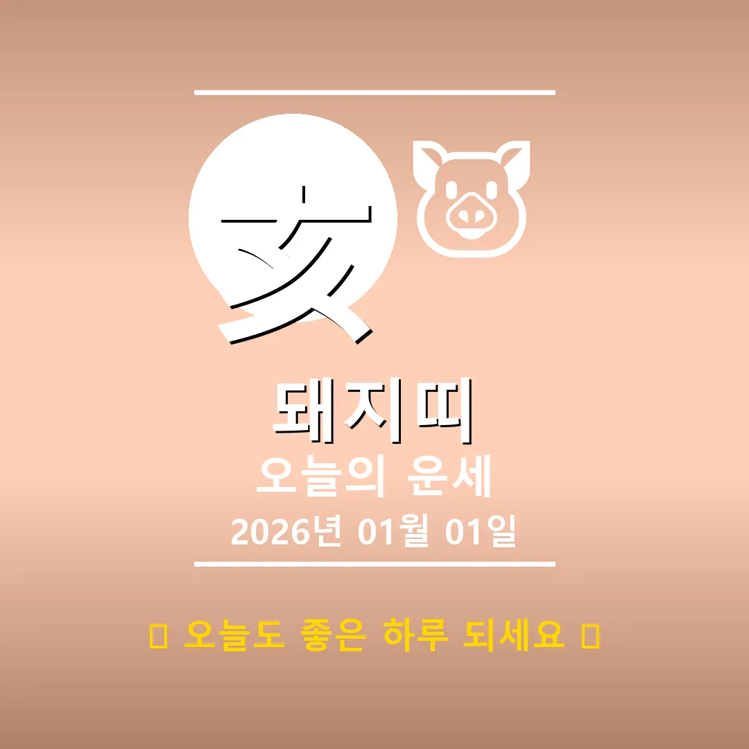 🐷 돼지띠 해당 연생 : 1911년, 1923년, 1935년, 1947년, 1959년, 1971년, 1983년, 1995년, 2007년, 2019년생 2026년 1월 1일, 희망찬 새해 첫날 돼지띠 여러분! 오늘은 乙未(을미)일주로, 잔잔한 호수 위에 떠 있는 달처럼 아름다운 기운이 감도는 날입니다. 사주에 水(수) 기운이 강하고 천을귀인(귀인의 도움)이 함께하니, 예상치 못한 행운이 찾아올 수도 있겠어요. 다만, 단교관살(인간 관계에 주의)이 있으니 언행에 신중을 … Read more