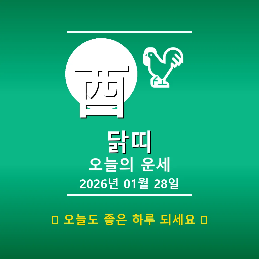 🐕 개띠 해당 연생 : 1910년, 1922년, 1934년, 1946년, 1958년, 1970년, 1982년, 1994년, 2006년, 2018년생 오늘 개띠 여러분! 2026년 1월 28일은 丙午(병오)년의 기운이 강하게 느껴지는 날입니다. 사주를 펼쳐보니 일주가 丁巳(정사)로, 따뜻한 불의 기운을 품고 있네요. 활활 타오르는 불처럼 열정적인 하루가 예상되지만, 한편으로는 지나치게 뜨거워지지 않도록 주의가 필요해요! 📊 오늘의 개띠 운세 요약 운세 항목 오늘의 … Read more